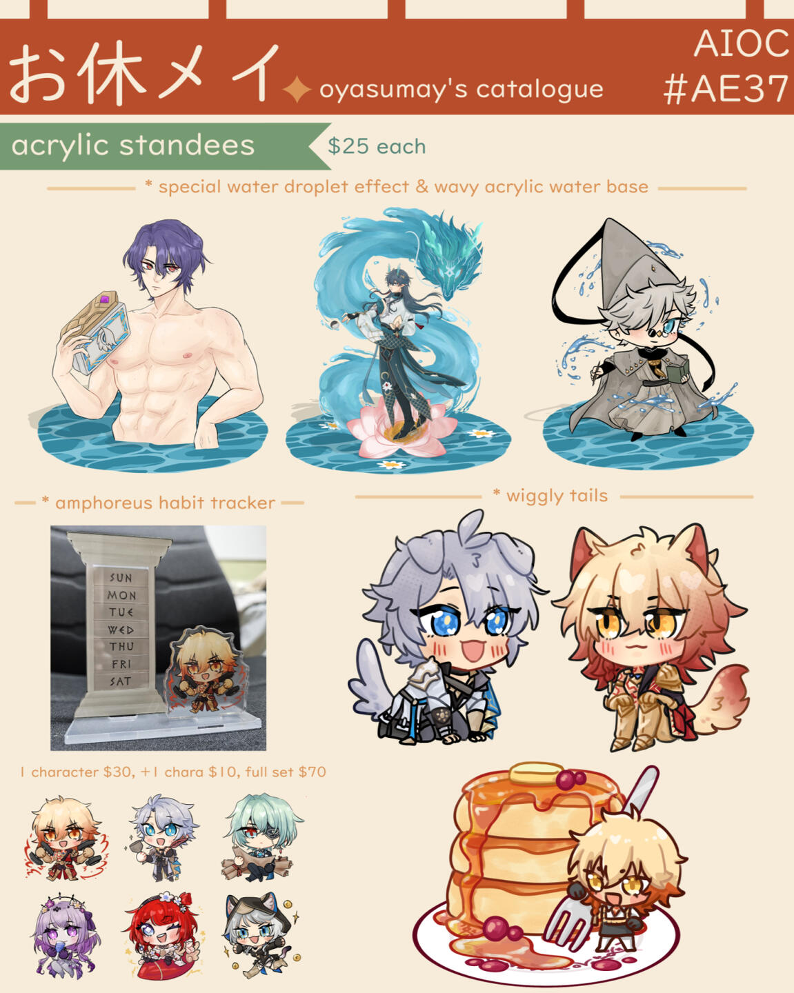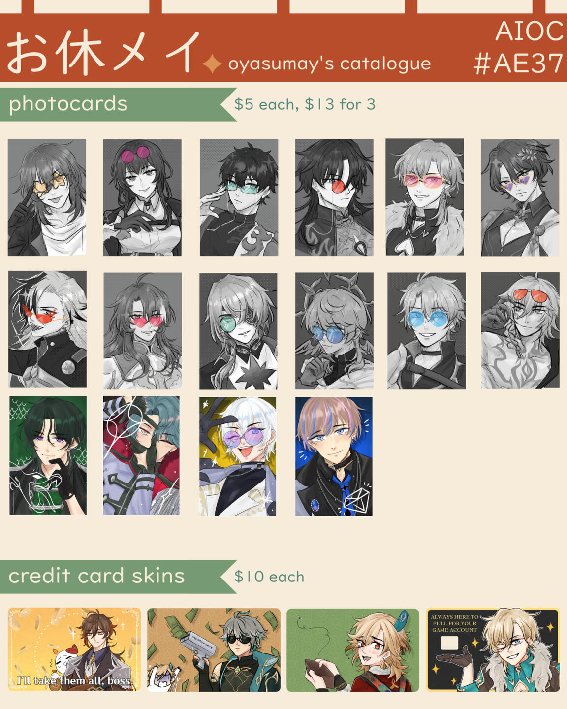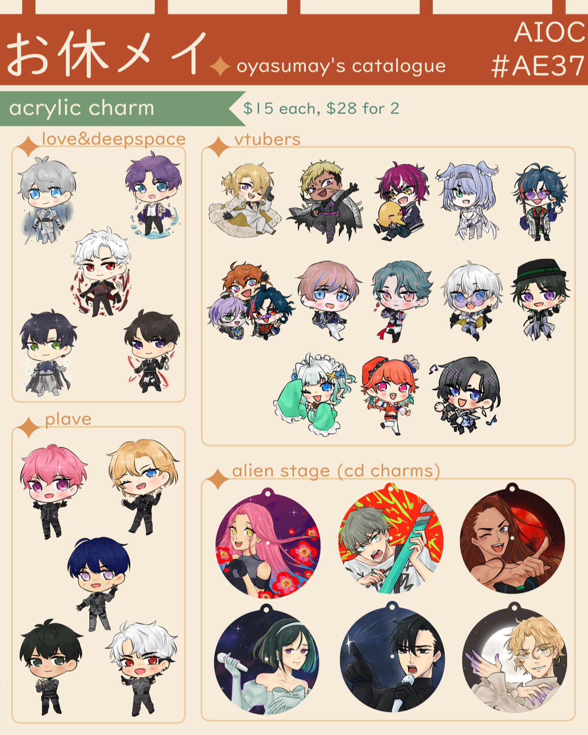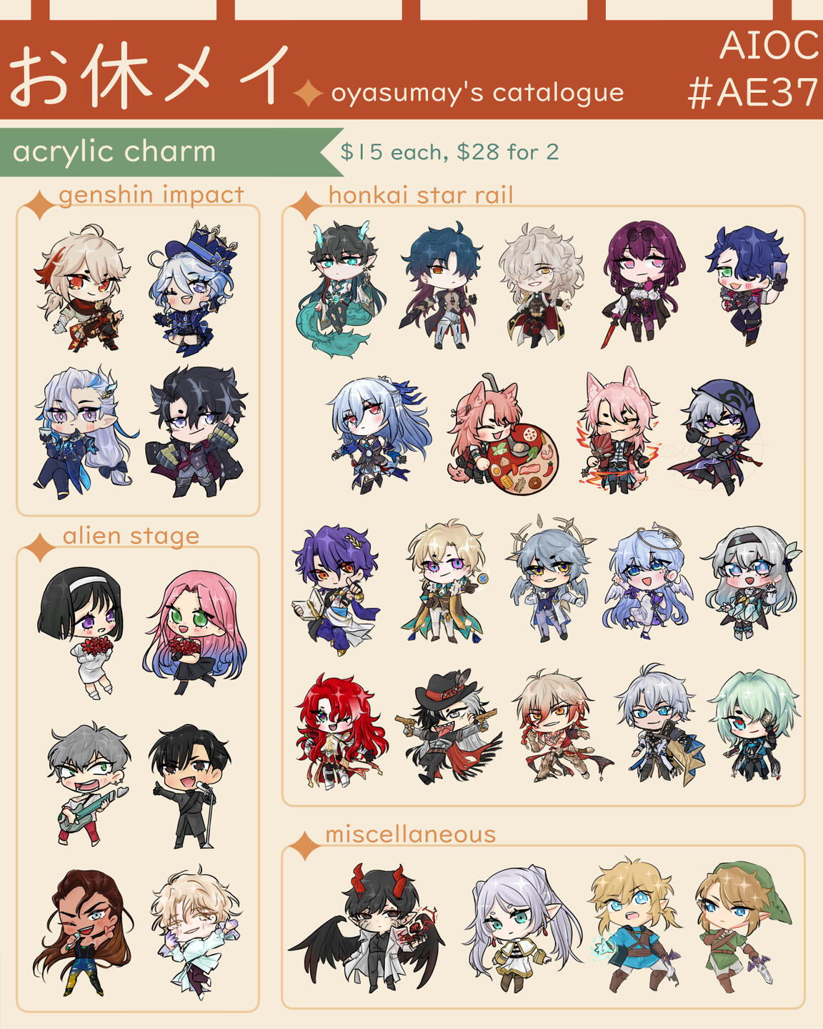 ✦ Printed: Acrylic charms, acrylic standees, stickers, prints, lanyards, credit card skins, button pins, deskmats